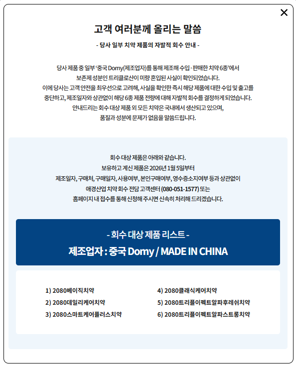 최근 일부 2080 치약 제품에 대한 자발적 회수 조치가 진행되면서,